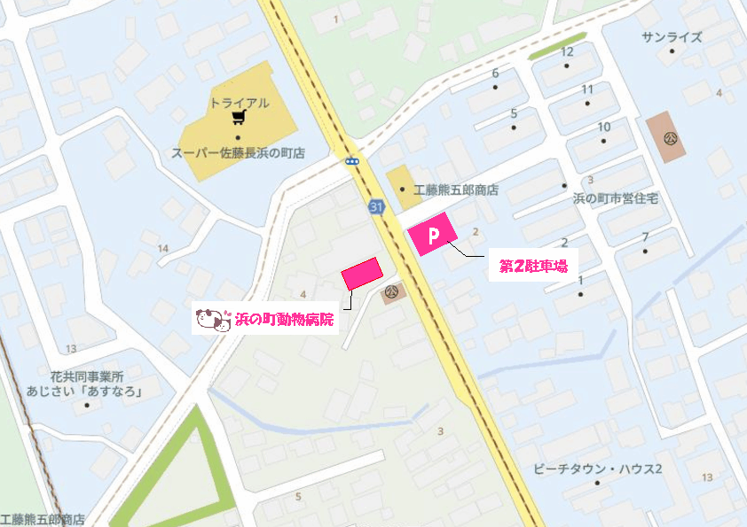→トライアル浜の町店様の交差点の約40m先右手にあります
